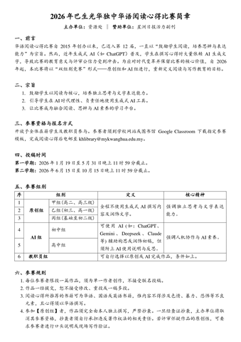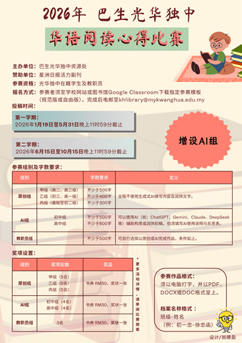 周一 1月 12 华语阅读心得比赛 致: 全体教职员生2026年第一学期“华语阅读心得比赛”由资源处所主办的2026年第一学期“华语阅读心得比赛”已开始,請有兴趣的老师和同学们参阅活动简章以了解更多活动詳情。欢迎全体老师和同学踊跃参与,共同打造人文书香校园,谢谢。资源处 启