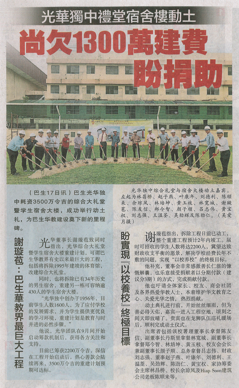 动土仪式启动,本校礼堂宿舍楼尚欠1300万盼捐助